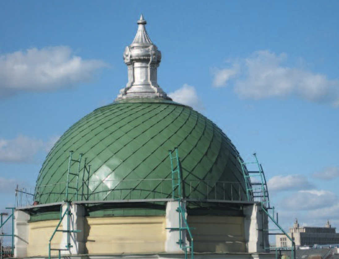 Завершающая часть купола тоже выполнена вертикальным двойным фальцем, соединяющим между собой трапециевидные картины. А верхний ряд ромбов не имеет пологих лежачих фальцев, как это было раньше. Таким образом, и с точки зрения эстетики, и с точки зрения надежности новый купол, конечно, сделан по последнему слову современной кровельной науки и техники. Причем сделан по отечественной технологии, с использованием российского станка и настоящими российскими профессионалами, добросовестно освоившими весь современный европейский опыт коллег.